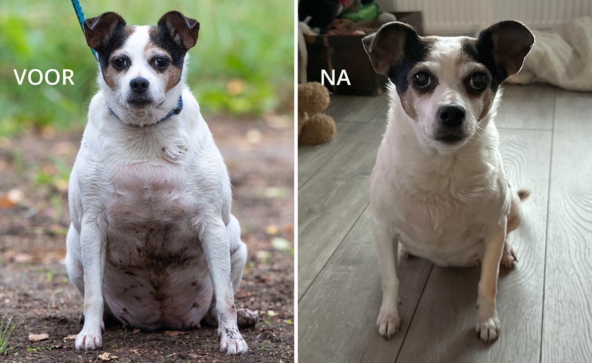 Op de voor- en na-foto hieronder zie je Shiva. De 12-jarige Boerenfox kwam afgelopen jaar in onze seniorenopvang terecht. Ze woog op dat moment 13,9 kg. Toen ze kort daarna naar haar nieuwe baasje Anna vertrok, woog ze nog 13,1 kg en kon ze - op langzaam tempo - een rondje van 20 minuten wandelen.