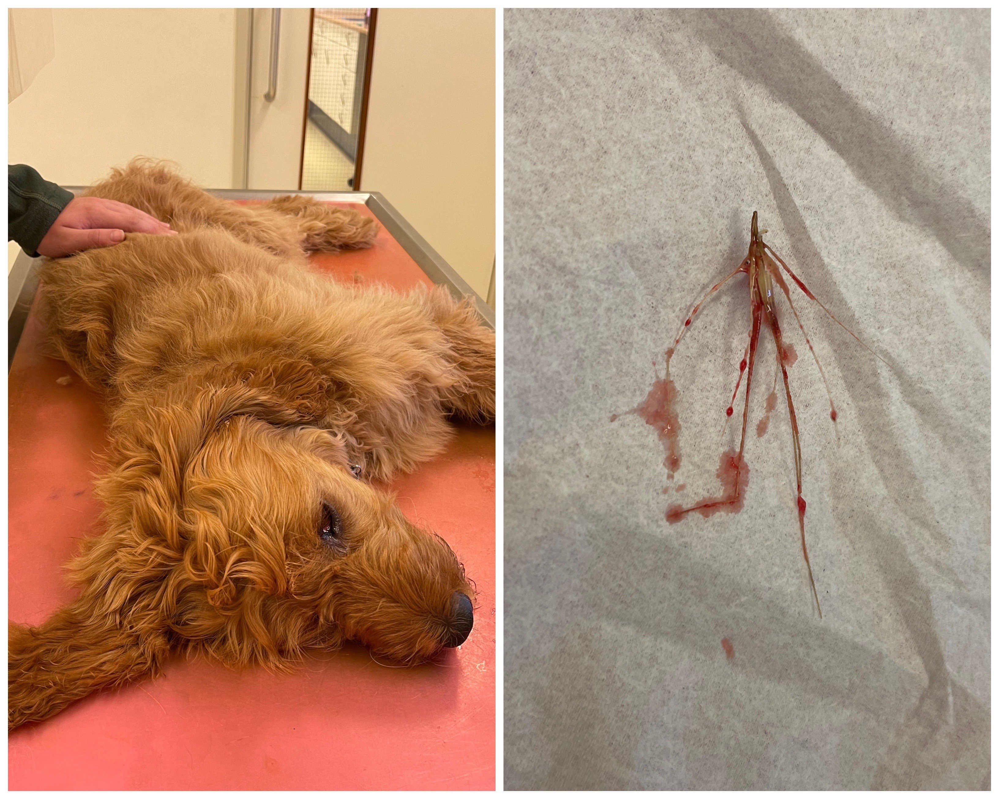 Woozle (destijds nog geen 4 maanden oud) uit Almere kreeg tijdens het snuffelen een grasaar in de neus. De aar -die al richting zijn hersenen was gekropen- moest onder narcose worden verwijderd