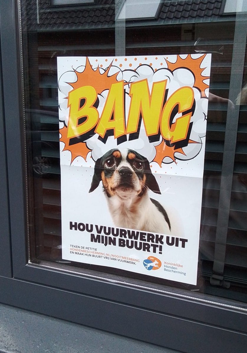 Met een brandbrief aan de verantwoordelijke ministers hebben we de stem van honden vertegenwoordigd en opgeroepen tot een landelijk verbod op consumentenvuurwerk. En in 2022 en 2023 konden hondeneigenaren gratis de raamposter 'Hou vuurwerk uit de buurt van honden' bij ons bestellen om vuurwerkangst bij honden onder de aandacht te brengen. Vele duizenden mensen hebben dat gedaan.