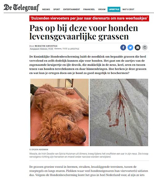 Ze lijken onschuldig, maar grasaren veroorzaken elk jaar enorm veel leed voor honden en hun baasjes. Samen met FLORON (Floristisch Onderzoek Nederland) pleiten wij voor meer ecologisch bermbeheer om het aantal grasaren te verminderen en de biodiversiteit te vergroten. Win-win!