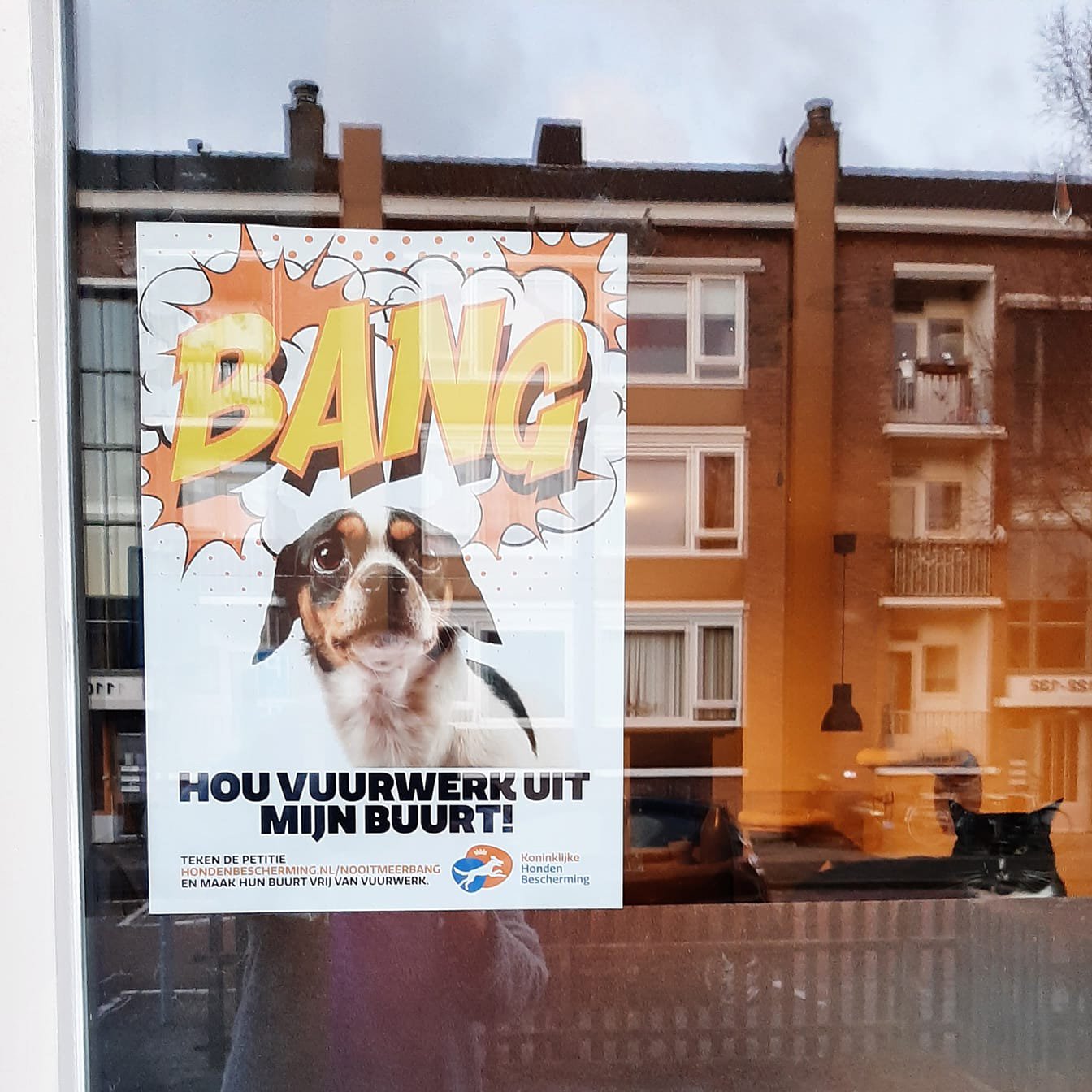 In 2022 en 2023 konden hondeneigenaren gratis de raamposter 'Hou vuurwerk uit de buurt van honden' bij ons bestellen om vuurwerkangst bij honden onder de aandacht te brengen. Vele duizenden mensen hebben dat gedaan. De poster is niet meer te bestellen, maar wel nog te downloaden om zelf uit te printen.